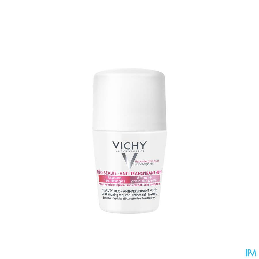 Le Déodorant Anti-Transpirant et Anti Repousse 48H de Vichy est un roll-on qui contribue à lutter contre la transpiration excessive tout ralentissant le processus de repousse des poils chez les peaux épilées. Son action anti-transpirante protège la peau jusqu'à 48 heures grâce à sa composition riche en sels d'aluminium. Son parfum frais aide à masquer les odeurs désagréables causées par une transpiration excessive. La formule hypoallergénique a été testée sous contrôle dermatologique et convient à la peau sensible.