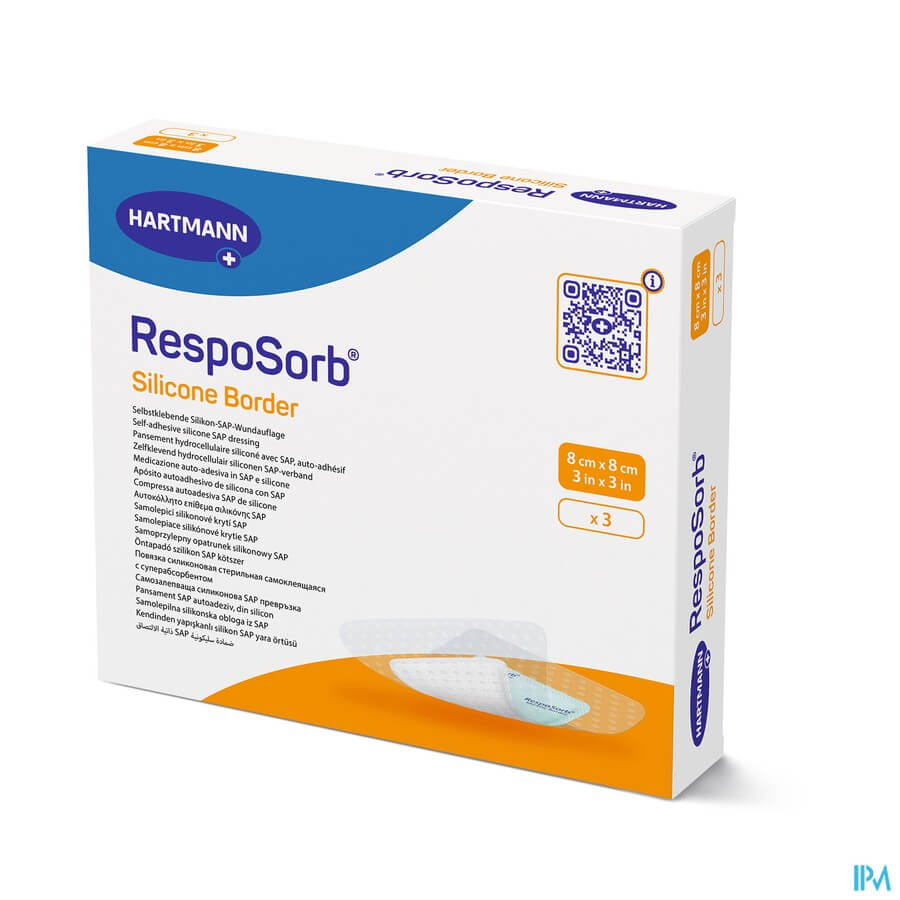 RespoSorb Silicone Border est un pansement hydrocellulaire autocollant stérile recouvert d'une couche de silicone. Le pansement se compose d'une couche de contact perforée en silicone, d'une couche arrière semi-perméable en polyuréthane et d'une compresse absorbante verte entre ces deux couches. Ces couches sont fixées entre elles à l'aide d'un adhésif acrylique. La couche arrière est perméable à l'air mais imperméable à l'eau, ce qui permet au patient de prendre une douche. La couche de silicone facilite l'application du pansement et empêche celui-ci d'adhérer à la plaie. Au-dessus de la couche de silicone, le produit est recouvert d'un tissu non tissé hydrophile blanc (viscose et polypropylène). La compresse absorbante est composée de cellulose et de polyacrylate superabsorbant (SAP) pour l'absorption et la rétention de l'exsudat. Elle est enveloppée dans un tissu cellulosique hydrophile pour la diffusion de l'humidité. Il est recouvert d'un tissu non tissé hydrophobe vert en polypropylène qui indique le côté qui n'entre pas en contact avec la plaie.