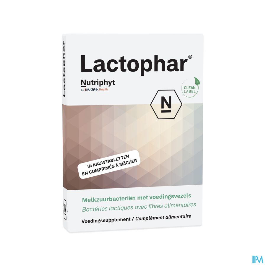 Synbiotiques : Bactéries lactiques avec fibres alimentaires en comprimé à mâcher. Lactophar est une combinaison équilibrée de bactéries humaines bénignes avec les fibres alimentaires nécessaires sous la forme d'un comprimé pratique à mâcher.
