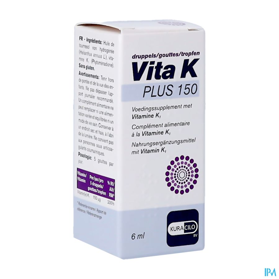 Vita K Plus 150 Gouttes Fl 6ml est un complément alimentaire disponible en pharmacie. Il ne peut se substituer à un mode de vie sain et à une alimentation variée et équilibrée. Ne prenez pas plus que la dose quotidienne recommandée indiquée sur l'emballage. Demandez conseil à votre pharmacien. Tenir hors de portée des enfants.